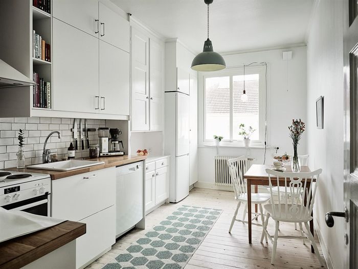 Вторая кухня, которую мы решили рассмотреть, полностью выполнена в белом цвете. Её интерьер очень лаконичный, сдержанный и стильный. Здесь нет лишнего декора и ярких цветовых всплесков. Кухонная утварь максимально спрятана в многочисленные шкафы, ножи хранятся на магнитном держателе – с первого же взгляда видно, что хозяева кухни любят порядок. В небольшом пространстве они нашли место даже для небольшой кулинарной библиотеки.