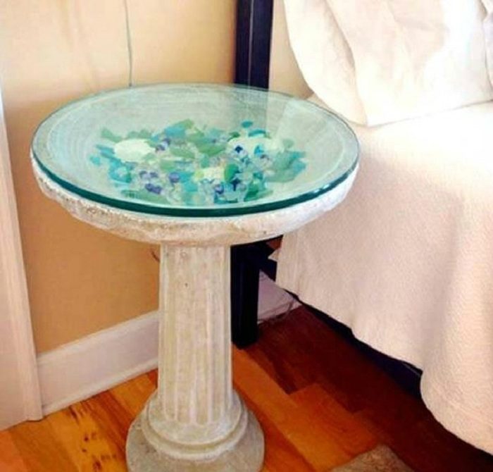 Старый стол декорирован цветным стеклом, что дало ему право на новую жизнь.
