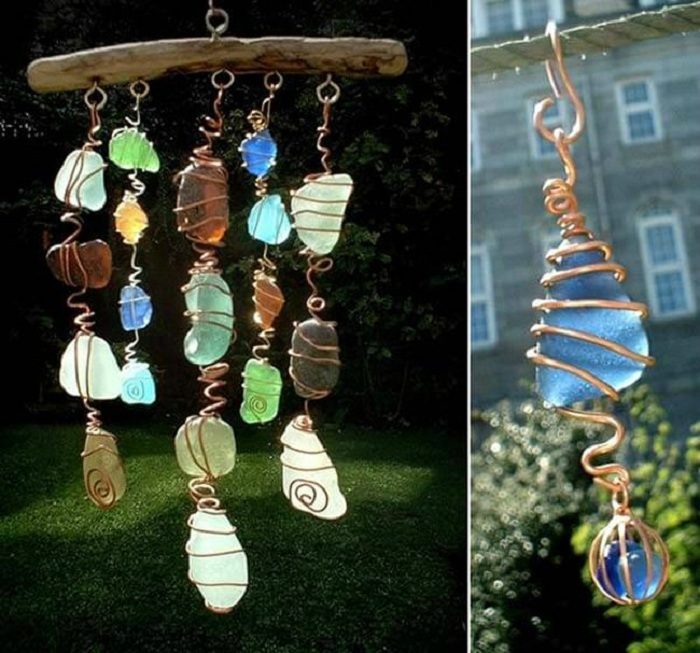 Прекрасное украшение из проволоки, цветного стекла и дерева, которое еще называют — улавливатель солнца.