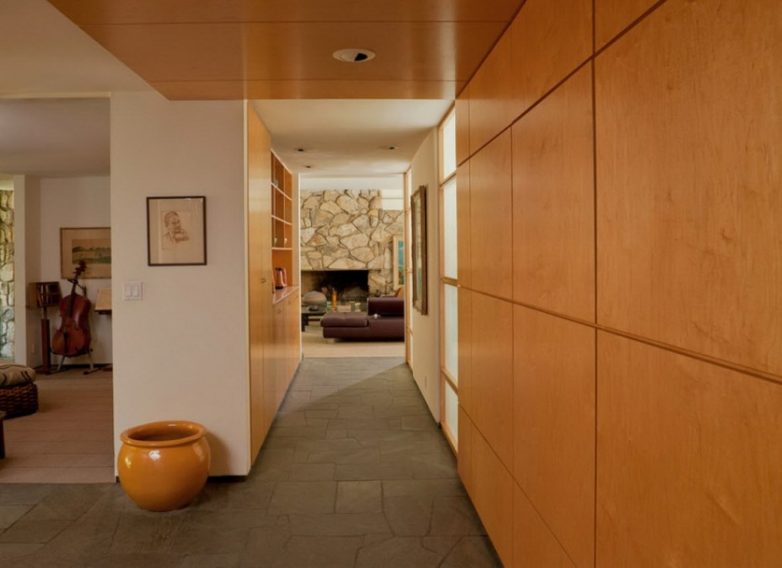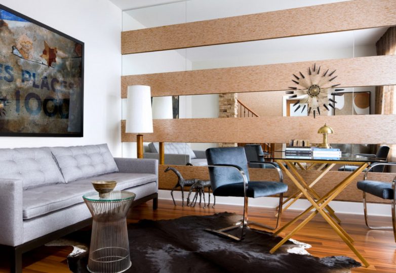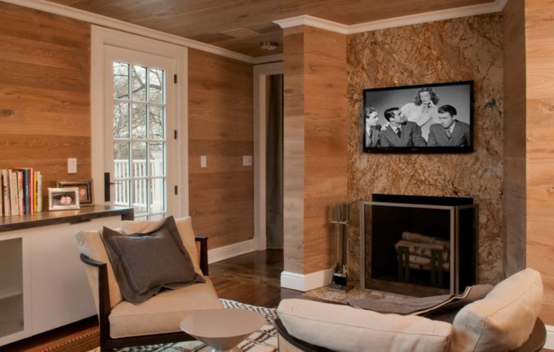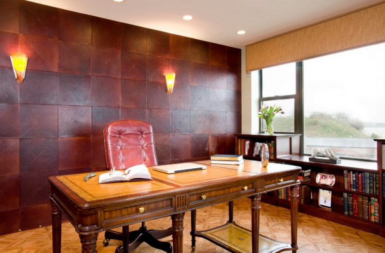 – Панели на всей стене. Панели из натуральных материалов или с имитацией дерева часто используют для облицовки всех стен в кабинете, частной библиотеке или бильярдной. Такое решение призвано придать строгость интерьеру и продемонстрировать статус его владельца.