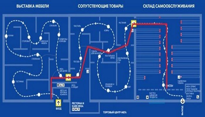 На самом деле, почти любой магазин или стенд этой компании напоминает лабиринт, который спроектирован так, чтобы покупатель увидел по дороге все возможные товары. Среди сотрудников эта планировка называется «Длинный естественный путь»