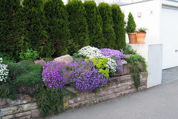 Вот пример такой живой изгороди из хвойных растений и многолетних кустарников: