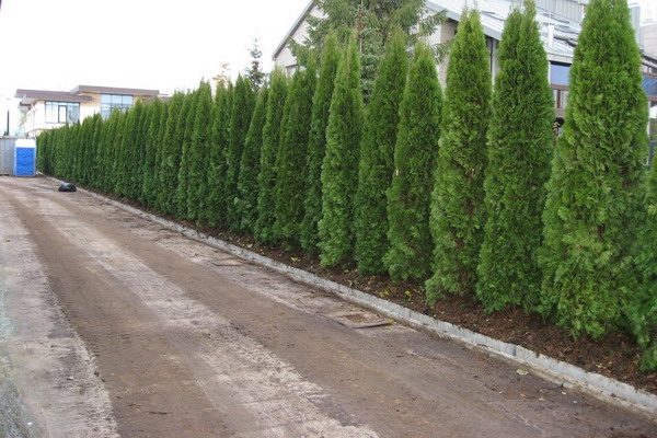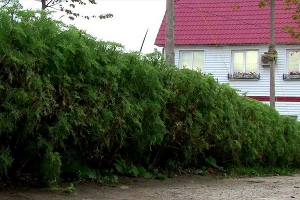 Видовые растения, выращенные из семян, относительно дешевы, но, естественно, не столь шикарны, как сортовые. Материал для туевой изгороди можно вырастить не только из семян, но и из черенков, в последнее время туи высотой 50-60 см недорого продают и сетевые гипермаркеты. Живую изгородь сажают на расстоянии 50 см, в первый год их не стригут.