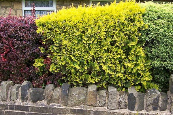 В многорядных многолетних живых изгородях эффектно смотрится комбинация контрастно окрашенных растений (например, интересно смотрится сочетание светлозеленой и темно-пурпурной листвы, желтолистные кустарники ярко заиграют на фоне темной хвои).