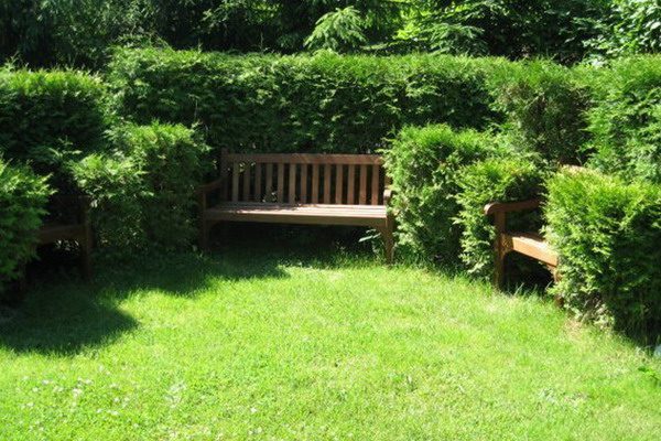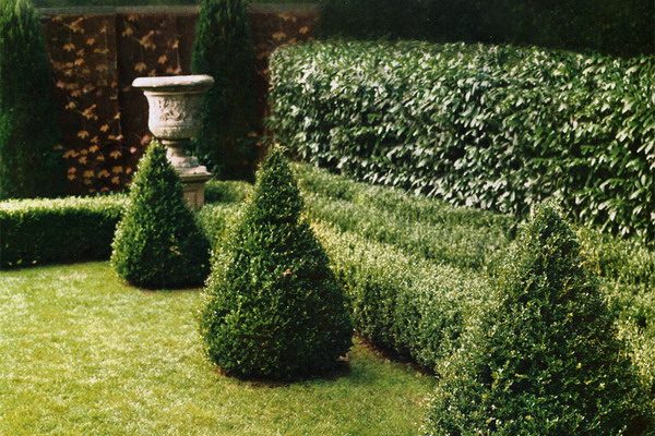 Если живые изгороди пересекаются под прямым углом, то одна из них может быть с темно-зелеными глянцевыми листьями, например из кизильника блестящего, а другая с матовыми светло-зелеными листьями, например из спиреи аргуты.
