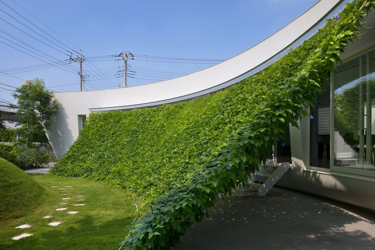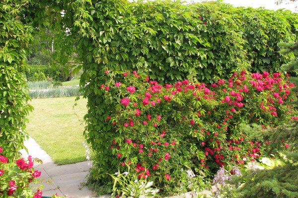 Оригинально выглядит живая изгородь со вставками из лиан, не занимающая при этом много места.
