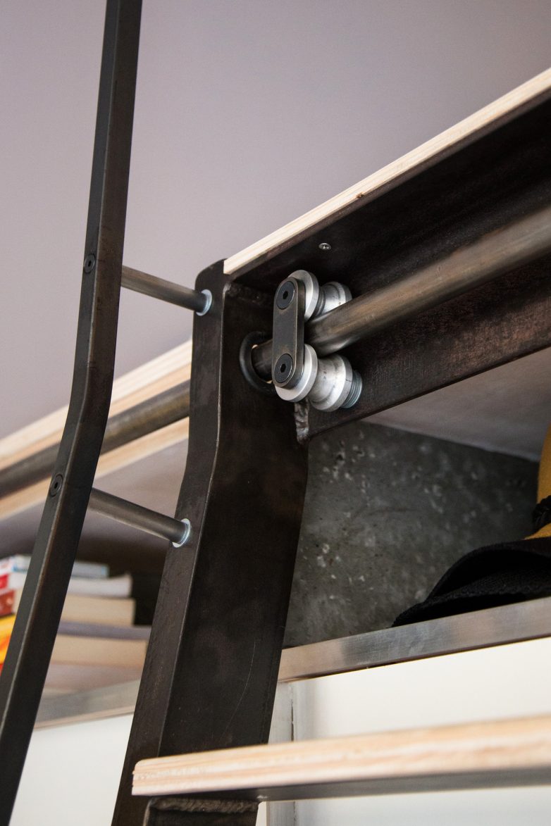 Все элементы интерьера были разработаны в индивидуальном порядке для данного проекта и изготовлены под заказ, включая гостевую кровать, обеденную зону, полноразмерный шкаф и просторную спальню. В качестве материалов использовали бетонные панели, деревянные планки и металлические детали, а также созданные плотниками из Окленда готовые элементы конструкции.