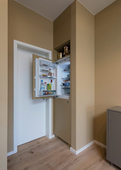 Слева, напротив встроенной микроволновки и духовки, построена аналогичная ниша для холодильника с морозильной камерой. Дверцы холодильника, кажется, имеют тот же песочный цвет, что и стены. Над холодильником располагается открытая ниша для декоративной посуды, которая визуально облегчает полностью закрытую конструкцию.