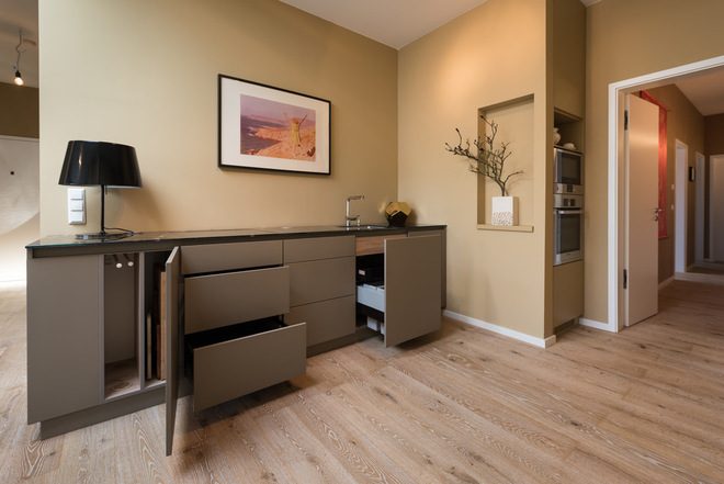 Владелец этой квартиры захотел поставить в своей квартире встроенную кухню, которую сложно распознать с первого взгляда. С идеей такой игры в прятки он обратился к берлинской команде Der Raum. Благодаря многолетнему опыту индивидуального проектирования бюро разработало функциональную открытую зону, в которой, действительно, едва можно узнать кухню.