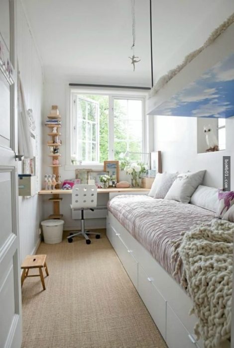Комната с компактным рабочим столом у окна, длинным диваном, оборудованным встроенными ящиками, и подвесной кровати.