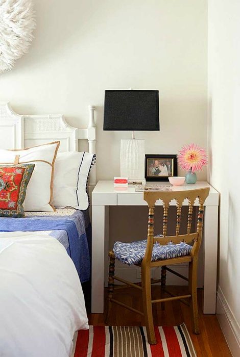 Небольшой столик вместо прикроватной тумбочки поможет совместить спальню и кабинет в одной комнате.
