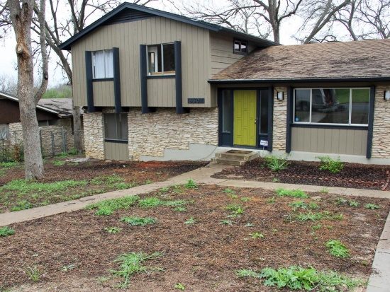 Чтобы сделать эту постройку более привлекательной, дизайнер догадался применить светлую нейтральную цветовую палитру, которая намного лучше сочетается нижней частью дома, выложенной камнем. Также хозяева данного жилища пожелали иметь неприхотливый сад, не требующий постоянного ухода, поэтому теперь мы видим в нем валуны, чередующиеся с кустиками местных засухоустойчивых растений, и очаровательное цветущее дерево багрянника канадского.