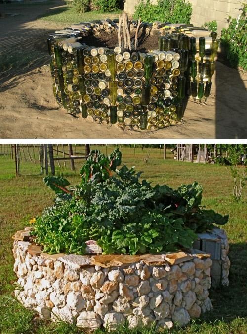 Построить из камня, кирпича, бетона или бутылок спиралеобразную грядку с постепенно поднимающимися к центру стенками.