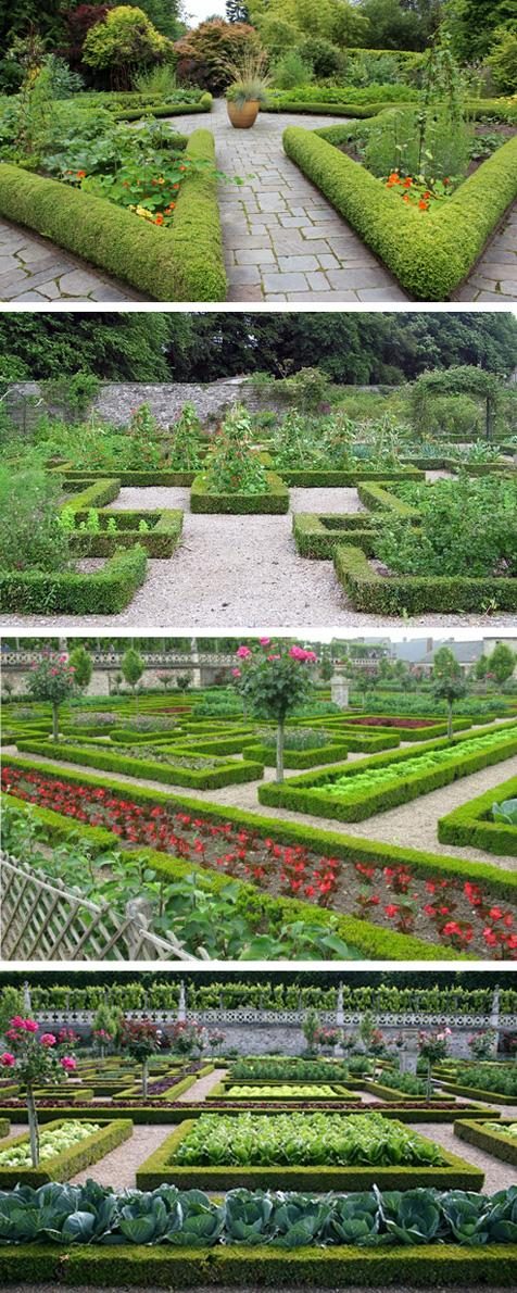 Торжественно смотрятся геометрические посадки с подстриженной живой изгородью в виде ограждения каждого сегмента. Такие огороды отлично впишутся в регулярный ландшафтный стиль. В качестве живого ограждения можно использовать густые посадки цветов, кудрявую петрушку, тонколистный или отклоненный тагетес.