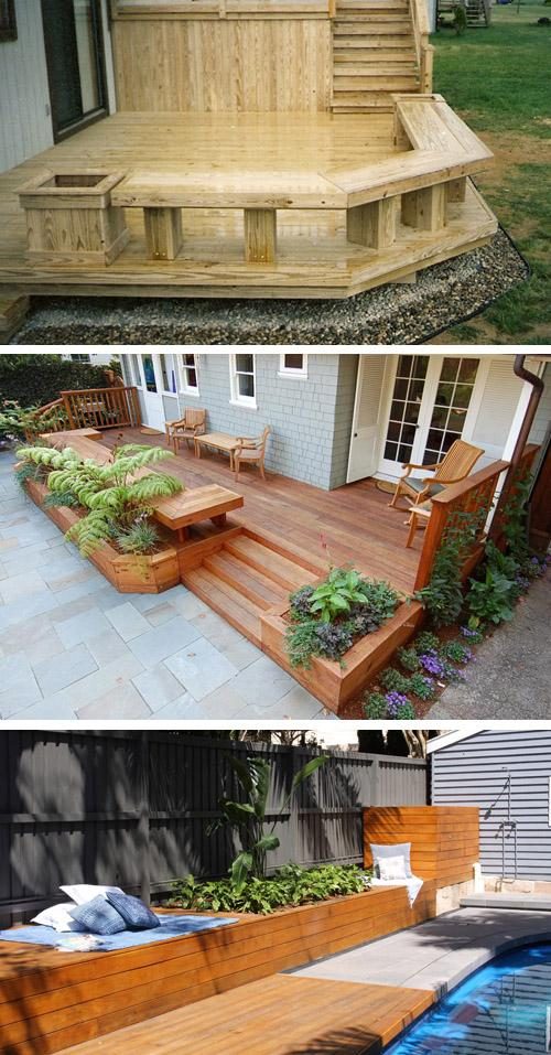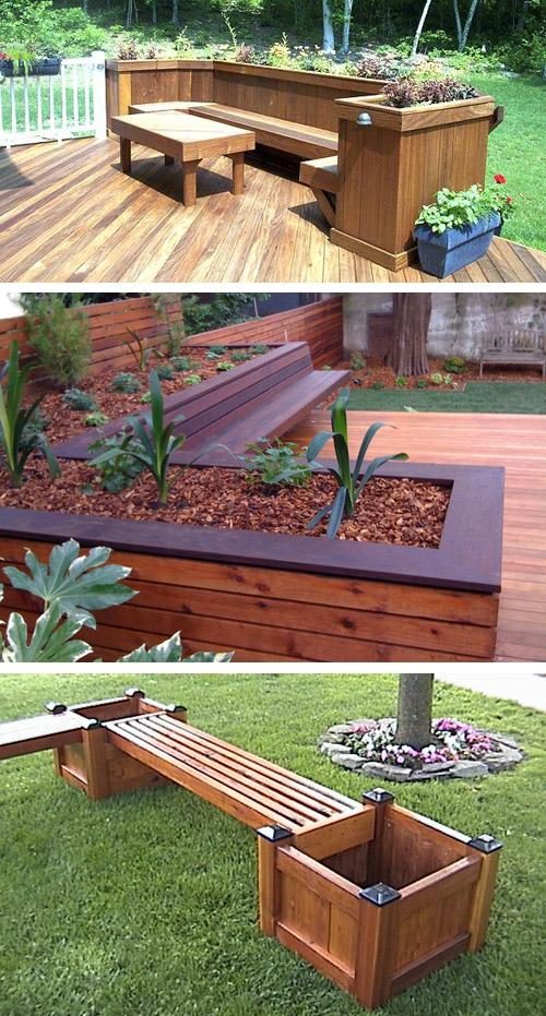 Другой распространенный вариант — интегрировать с ограждением террасы или крыльца или совмещать их с настилом открытой палубы. Подобные конструкции облагораживают вид и посадок, и сооружений, с которыми они объединены, если используется одинаковый материал для них.