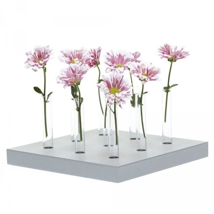 Очень стильно будут смотреться в интерьере удлинённые прозрачные вазы в виде пробирок. В них можно поставить розы, тюльпаны или хризантемы. Такая композиция внесёт в пространство ноты гармонии и упорядоченности.