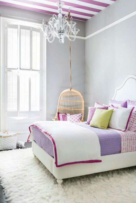Девичья спальня с серыми стенами и бело-сиреневыми аксессуарами.