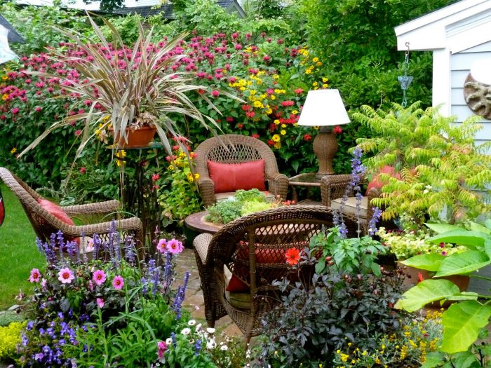 Плетенная мебель, утопающая в цветах и всевозможных растениях.