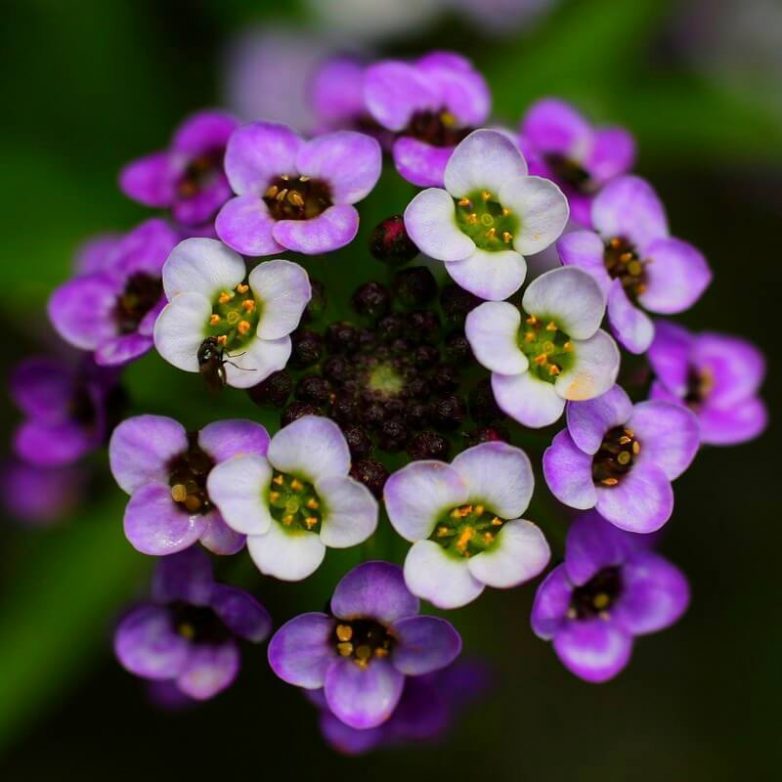 Цветы алиссума морского имеют белую или лиловую окраску, что используется при совместной посадке растений. После косметической стрижки и обильного полива алиссум готов к новой волне цветения. Посадив один раз данный ароматный однолетник, можно не беспокоится о подсеве семян в течение двух-трех лет. Алиссум отлично размножается самосевом.
