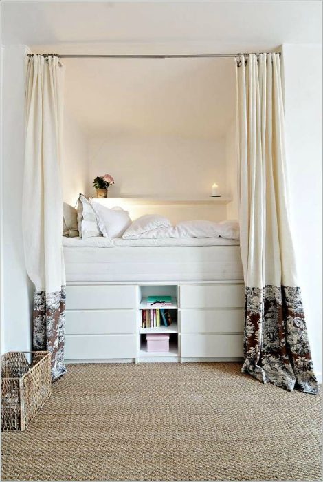 Кровать на подиуме со встроенными системами хранения и узкая полка вместо прикроватной тумбы — гениальная идея для обустройства маленькой спальни.