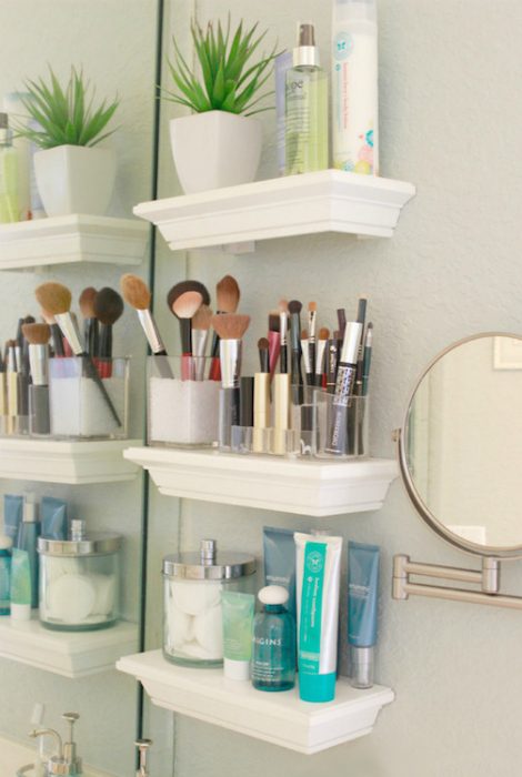 Несколько маленьких открытых полочек, расположенных в ванной возле умывальника идеально подойдут для хранения косметики.