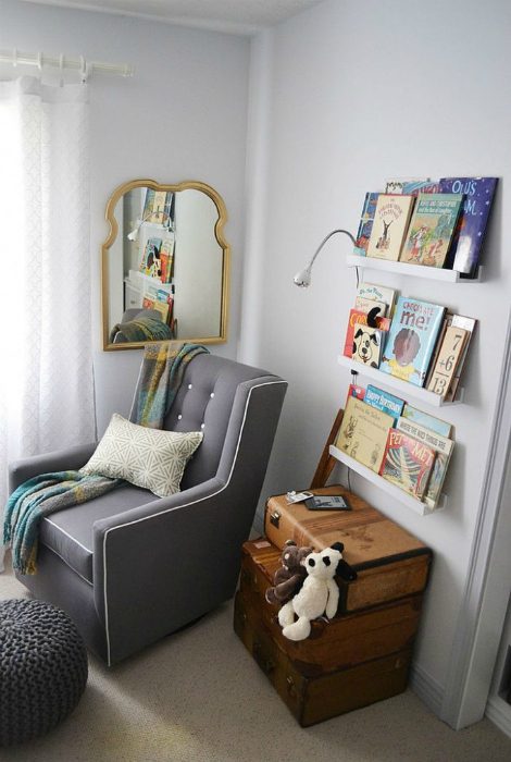 На стенах детской комнаты можно разместить несколько небольших полок открытого типа для хранения красочных изданий обложками наружу, а из старых чемоданов получится оригинальный комод для постельного белья и пеленок.