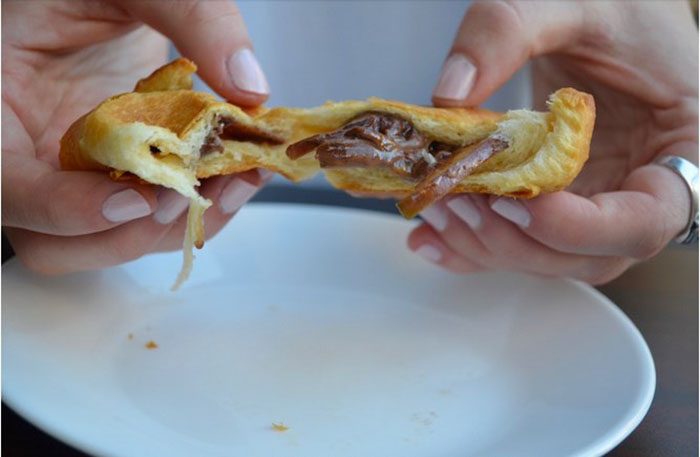 Рогалики с Нутеллой напоминают по вкусу рогалики с шоколадом, именно так выглядит паста в испеченном виде. Можно смело заменить Нутеллу, если у кого-то аллергия на орехи, шоколадом. На подготовленную заготовку для рогалика из слоеного теста выкладываем столовую ложку Нутеллы. Формируем рогалик и выпекайте около 10-12 минут, до золотистого цвета при температуре 180 градусов.