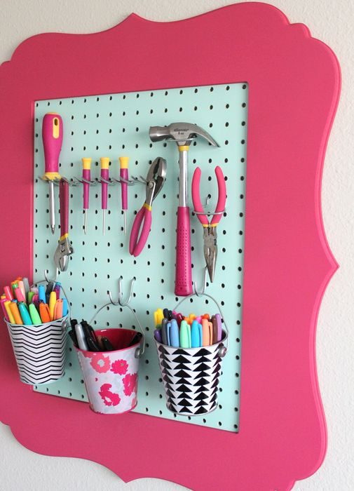 Хранить вещи в вертикальном виде очень удобно и экономично в плане свободного места. Для этих целей может понадобиться фанерная доска с дырочками, её сегодня не сложно найти в строительных гипермаркетах.