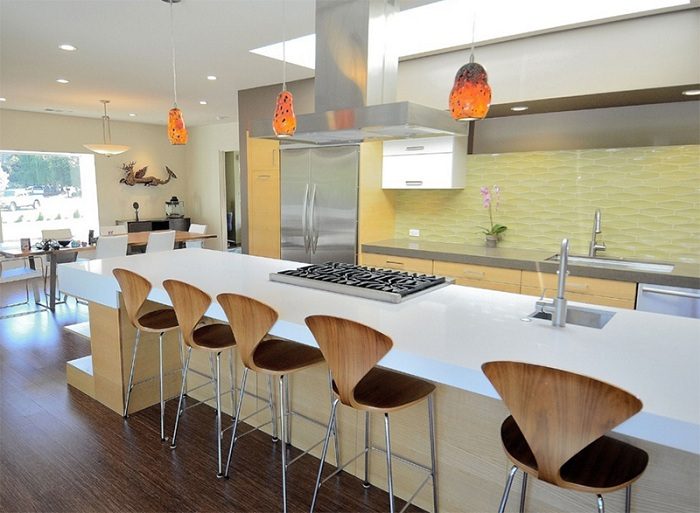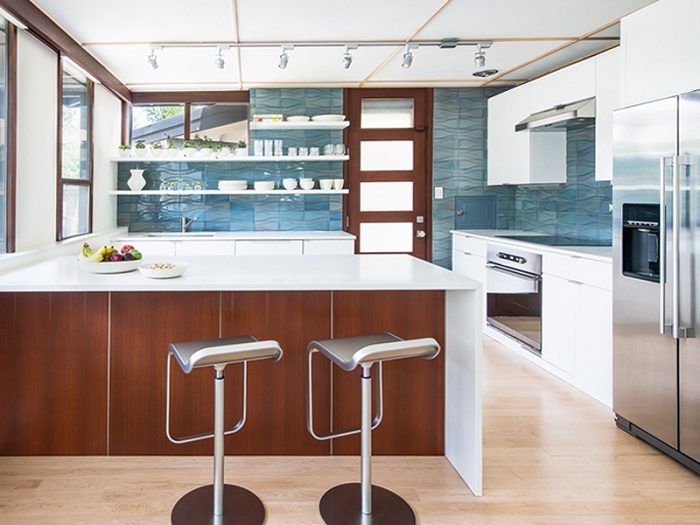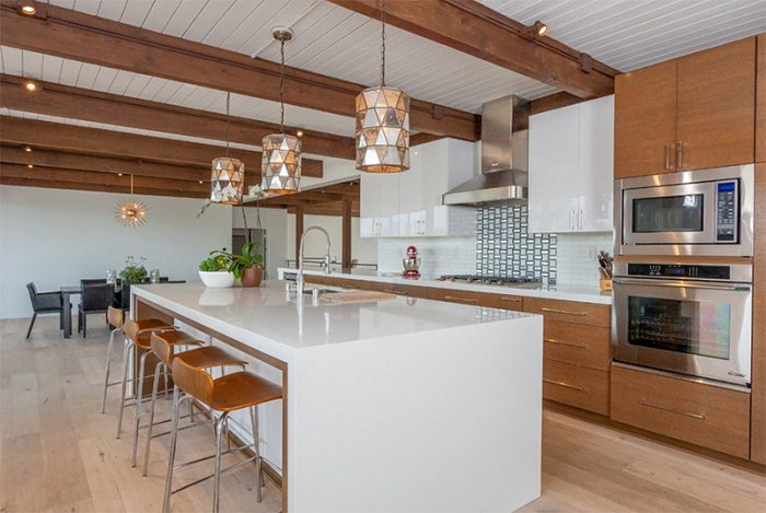 Керамическая плитка, которая имеет вид на океан, подчеркивает особенности дизайна такой интересной кухни.