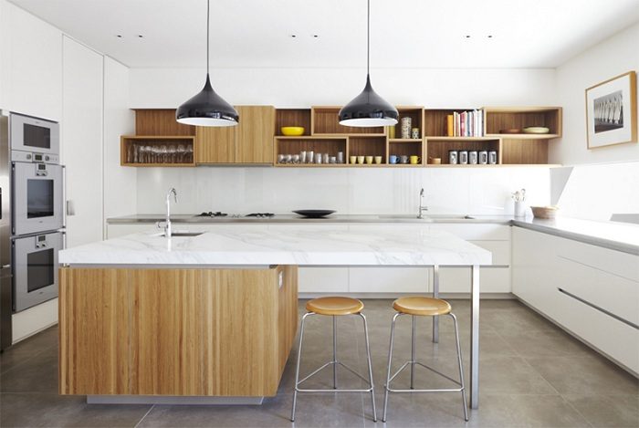 Кухня в светлых тонах с добавлением орехового — это симпатичное и отличное решение для дизайна в стиле модерн.