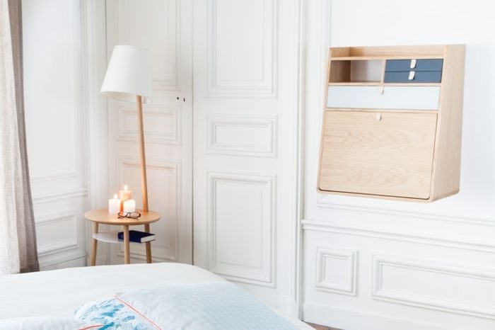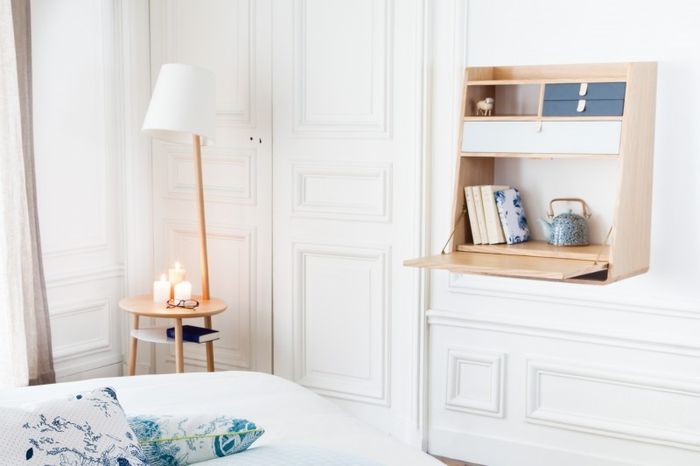 Иногда в маленькой спальне не хватает места для того, чтобы разместить в ней тумбочку, туалетный столик и рабочее место. Поэтому французский дизайнер Флоренс Ветин (Florence Watine) придумал многофункциональный и универсальный предмет интерьера. Это бюро, в котором есть дополнительные ящички и отсеки для хранения. Удобно, стильно и экономично с точки зрения площади.