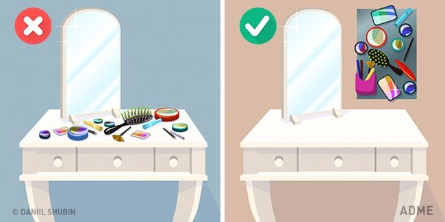 Чтобы все лежало на своих местах, нужно эти места создать. Например, расставить именные коробочки, в каждой из которых будут лежать какие-то конкретные предметы: расчески, канцелярия, косметика, блокноты и т. д.