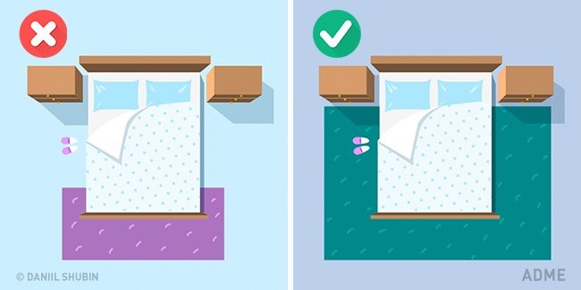 Бытует мнение, что чем меньше комната, тем меньше должен быть ковер, но это большое заблуждение. На самом же деле, маленький коврик рядом с кроватью визуально съест больше пространства, чем большой добротный ковер.