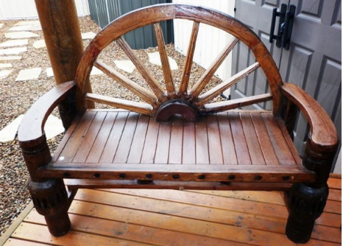 Удобная скамейка выполнена с элементом колеса украсит любое крыльцо около дома.