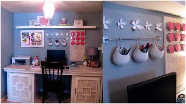 Чтобы освободить рабочее пространство на столе, некоторые предметы можно подвесить. Как оригинально применить этот подход в деле, написано здесь.