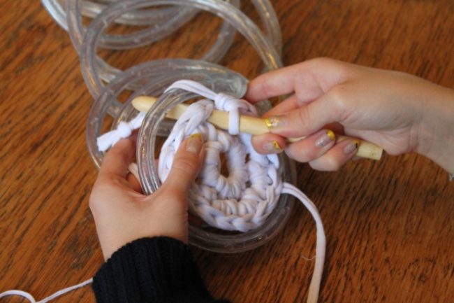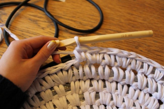 Кстати, стоит учесть, что размер вашего коврика зависит от длины шнура. Чтобы определить желаемые пропорции, нужно перед началом работы свернуть шнур по кругу. Это поможет вам выбрать правильную длину.