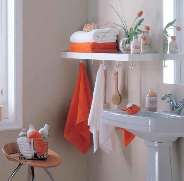 В ванной обязательно должна быть хотя бы одна навесная полка. Её можно дополнительно оснастить крючками или штангой для полотенец. Чтобы разнообразить интерьер, желательно подобрать несколько цветных полотенец, которые станут яркими акцентами пространства и разбавят монотонность.