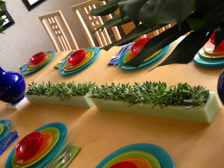 Настольные композиции из суккулентов или невысоких цветов здорово освежают обеденный стол. Более яркие растения и пышные цветы, расположенные в одну линию по центру, придутся кстати для торжественного ужина.