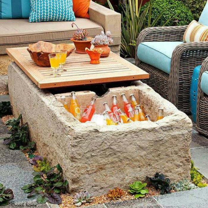 Оригинальный садовый столик с мобильной столешницей и отсеком хранения напитков.