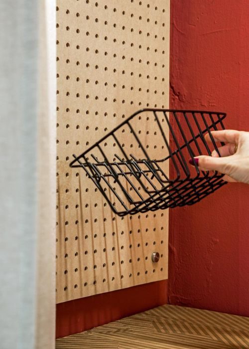 В качестве основной системы хранения в новом офисе выступает вертикальная доска с дырочками. Такую не сложно найти в любом строительном магазине. Этот простой элемент позволил разместить немало канцелярских предметов. При этом, удалось автоматически разгрузить пространство стола. Теперь ничего не мешает продуктивной работе!