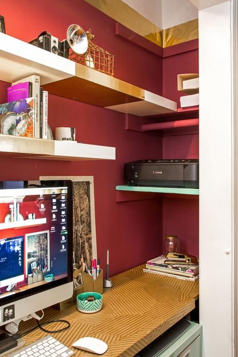 Это рабочее место располагается в небольшой однокомнатной квартире. Ему отвели пространство в нише, и спрятали его за шторой, чтобы визуально не загромождать комнату. Но изначально домашний офис выглядел угрюмо, был крайне непрактичным и совсем не украшал интерьер. Поэтому было решено переделать его и улучшить его функции.