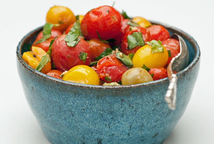 3. В течение 30-40 минут протушите помидоры до того, как помидоры размягчаться и пустят сок. Посыпьте помидоры зеленью и дайте им остыть до комнатной температуры перед подачей.