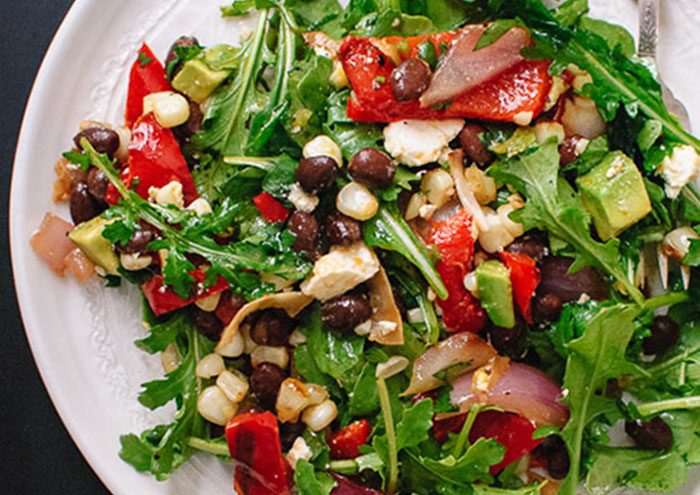 Этот остро-сладкий салат в своем составе содержит обжаренные на гриле кукурузу, болгарский перец, красный лук, руколу, сыр фета, черную фасоль и авокадо.