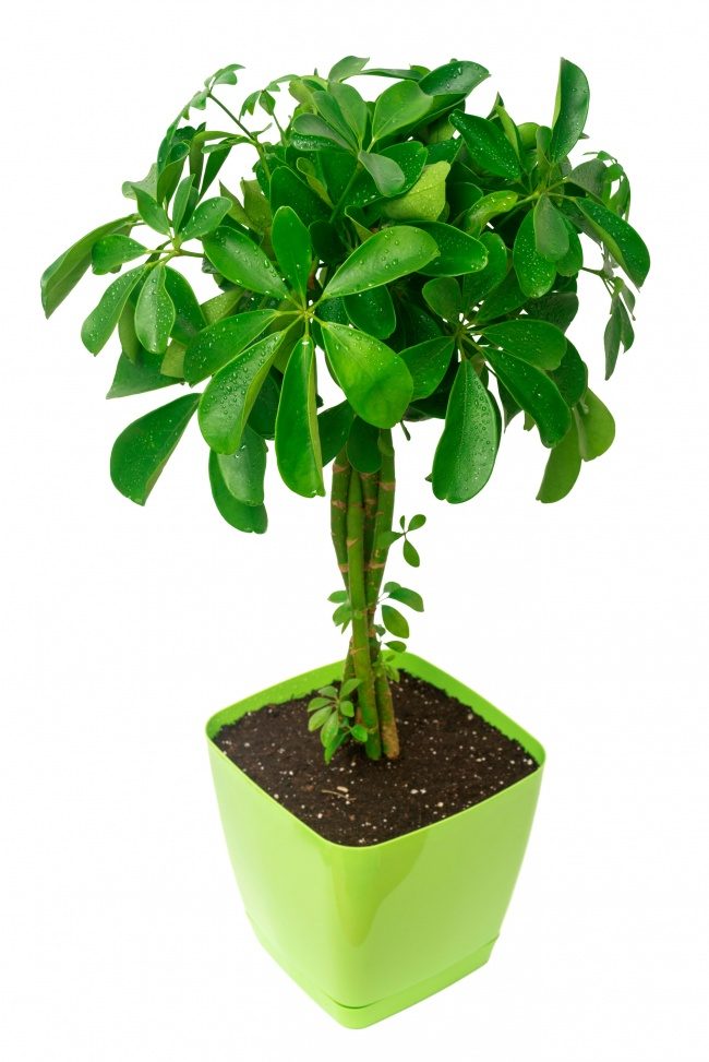 Очищает воздух от соединений формальдегида, толуола и бензола. В некоторых странах шеффлеру называют деревом-зонтиком, потому что листья, как спицы зонтика, выходят из одной точки.