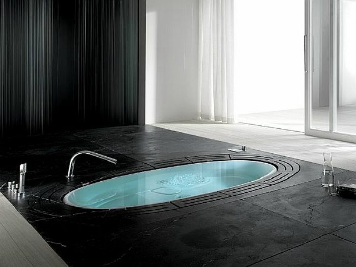 Современная черно-белая купальня, центральным элементом которой стала с невероятно красивая ванна, встроенная в пол.