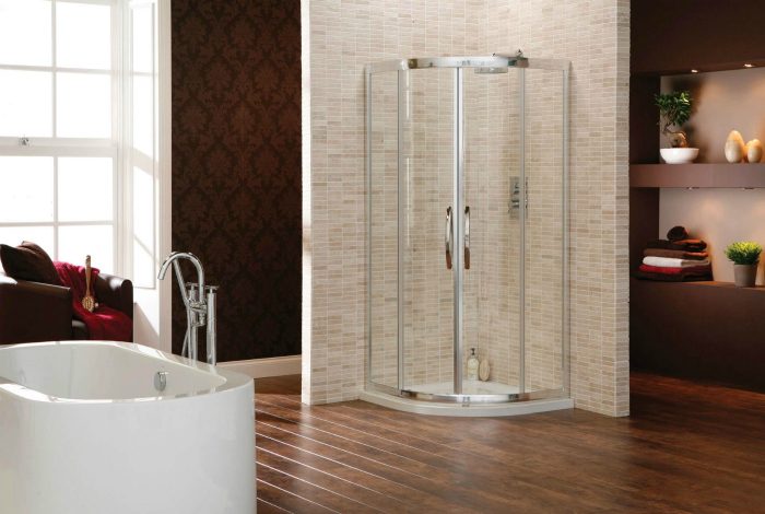 Стильная и комфортная ванная комната с душевой кабинкой, мягким диванчиком и кофейным столиком.