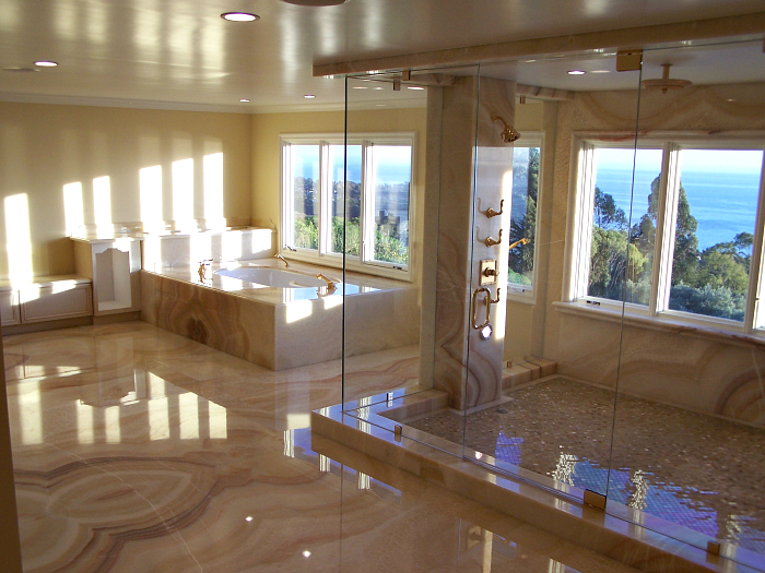 Просторная мраморная купальня с большой душевой кабинкой и автономной ванной.