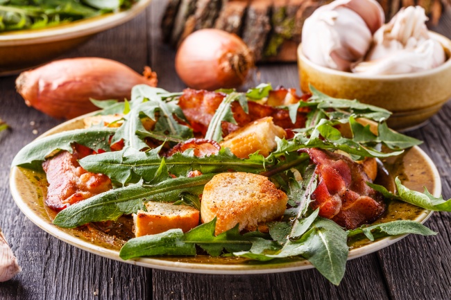 Бекон нарежьте, обжарьте в собственном соку и выложите на листья одуванчика и щавеля.