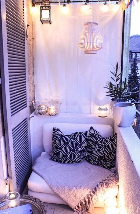 На балконе логично расположить небольшую мягкую зону, где будет удобно проводить время за чтением книг или просмотра фильмов. Организовать её не сложно, для этого понадобится несколько напольных подушек. Другой вполне приемлемый вариант – поставить компактную банкетку с мягким сидением и украсить её декоративными подушками.