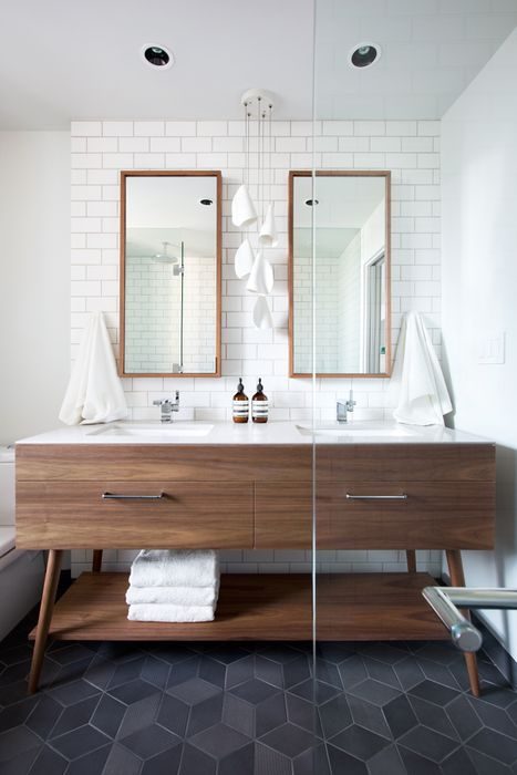 Некоторые считают, что двойными зеркалами уместно украшать лишь просторные ванные комнаты, на самом же деле, это ошибочное мнение. Такой приём создаёт иллюзию большего пространства. Кажется, что комната в два раза больше, чем есть на самом деле. Главное, чтобы дизайн рам был лаконичным, а сами зеркала максимально компактными.